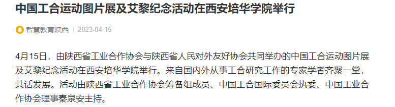 4月15日,由陕西省工业合作协会与陕西省人民对外友好协会共同举办的中国工合运动图片展及艾黎纪念活动在西安培华学院举行。来自国内外从事工合研究工作的专家学者齐聚一堂,共话发展。活动由陕西省工业合作协会筹备组成员、中国工合国际委员会执委、中国工业合作协会理事秦泉安主持。