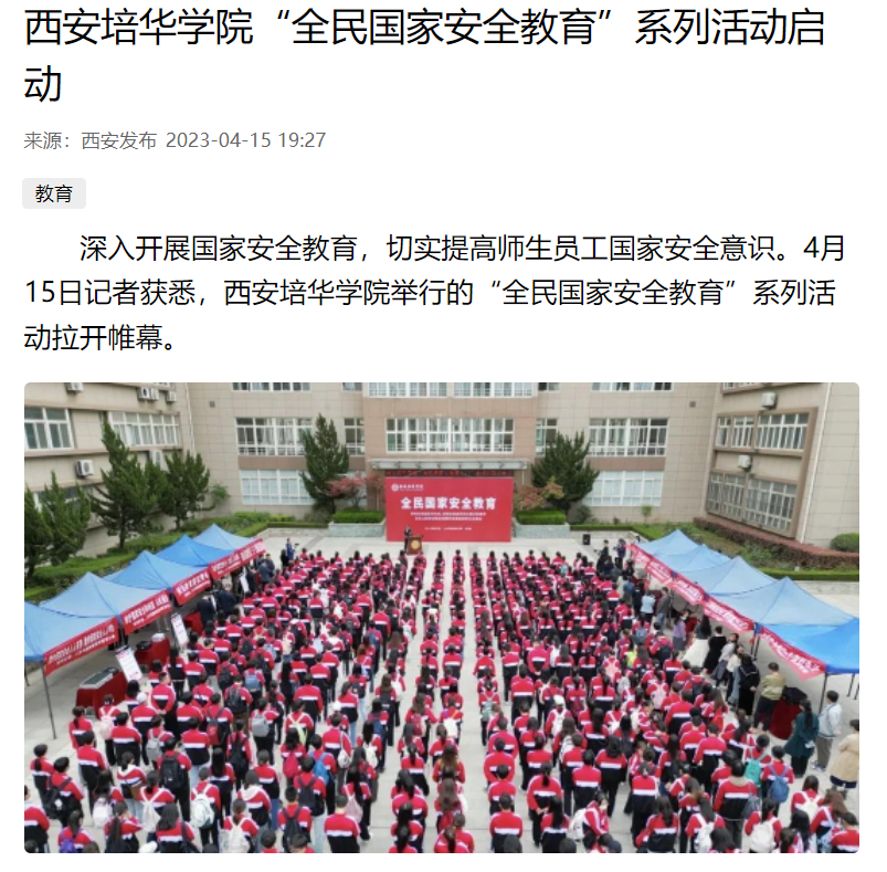 据悉,在国家安全宣传教育月期间,西安培华学院将通过专题讲座、安全教育巡展、主题短视频征集等系列活动,切实增强全民国家安全意识,进一步推动总体国家安全观教育在校园落地落实。