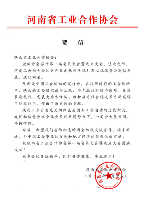 除此之外,中国工合国际委员会、河南省工业合作协会、甘肃省工业合作协会筹委会、路易艾黎研究中心等也向陕西工合的成立发来贺信,表示祝贺。