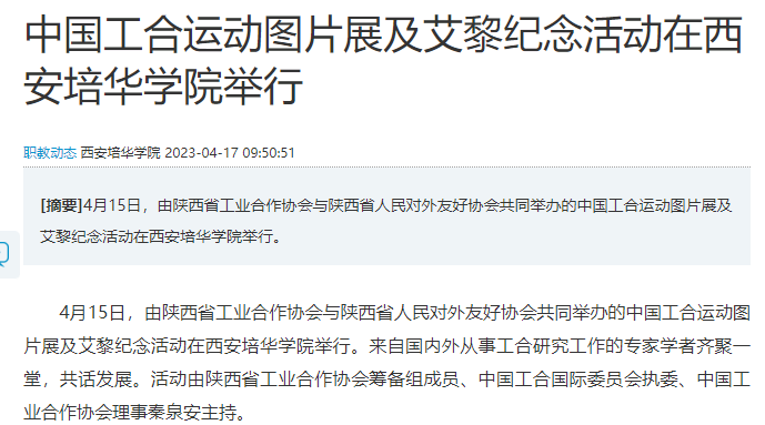 4月15日,由陕西省工业合作协会与陕西省人民对外友好协会共同举办的中国工合运动图片展及艾黎纪念活动在西安培华学院举行。来自国内外从事工合研究工作的专家学者齐聚一堂,共话发展。活动由陕西省工业合作协会筹备组成员、中国工合国际委员会执委、中国工业合作协会理事秦泉安主持。
