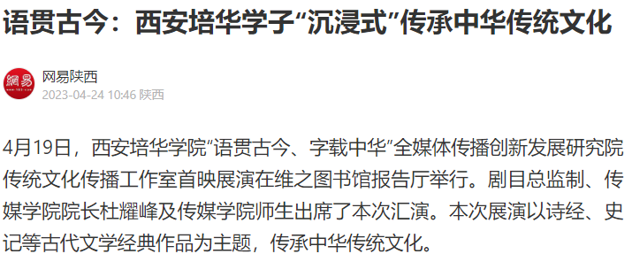 4月19日,西安培华学院“语贯古今、字载中华”全媒体传播创新发展研究院传统文化传播工作室首映展演在维之图书馆报告厅举行。剧目总监制、传媒学院院长杜耀峰及传媒学院师生出席了本次汇演。本次展演以诗经、史记等古代文学经典作品为主题,传承中华传统文化。