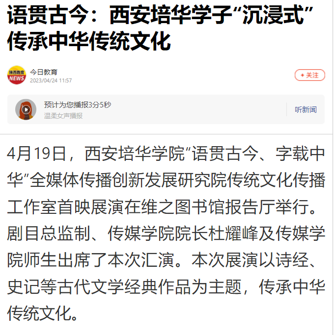 搜狐新闻:语贯古今:西安培华学子“沉浸式”传承中华传统文化