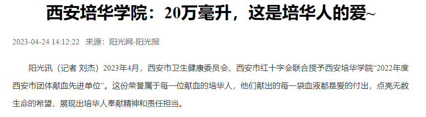 2023年4月,西安培华学院积极响应团省委号召,培华红十字会联合陕西省血液中心西安市中心血站、长安区红十字会在学校开展了主题为“青春献热血 挽臂为三秦”血车进校园无偿献血活动。累计献血量近20万毫升。