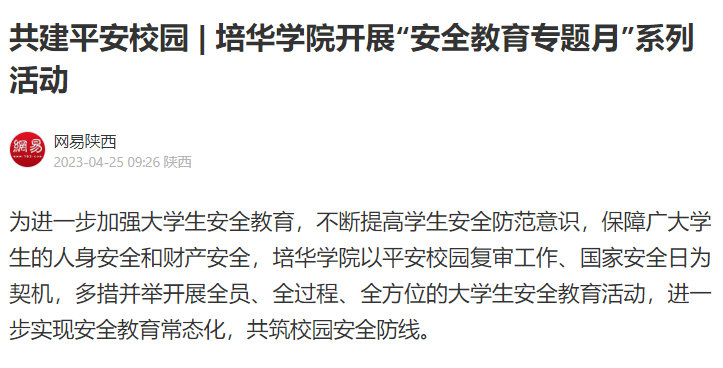 网易新闻:共建平安校园 | 培华学院开展“安全教育专题月”系列活动