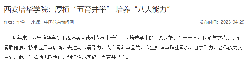 近年来,西安培华学院围绕落实立德树人根本任务,以培养学生的“八大能力”——国际视野与交流、身心素质健康、技术应用与创新、表达与沟通能力、人文素养与品德、专业知识与职业素养、自学能力、合作能力为目标,继承与弘扬优良传统,创造性地实施“五育并举”。