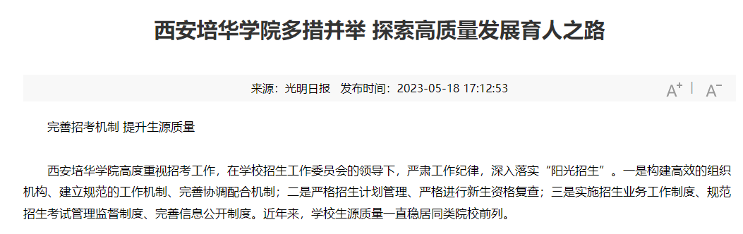 西安培华学院高度重视招考工作,在学校招生工作委员会的领导下,严肃工作纪律,深入落实“阳光招生”。一是构建高效的组织机构、建立规范的工作机制、完善协调配合机制;二是严格招生计划管理、严格进行新生资格复查;三是实施招生业务工作制度、规范招生考试管理监督制度、完善信息公开制度。近年来,学校生源质量一直稳居同类院校前列。