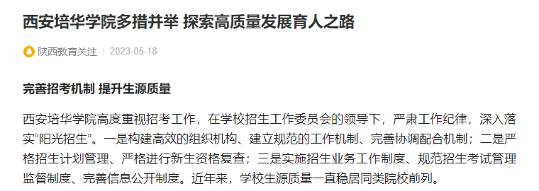 西安培华学院高度重视招考工作,在学校招生工作委员会的领导下,严肃工作纪律,深入落实“阳光招生”。一是构建高效的组织机构、建立规范的工作机制、完善协调配合机制;二是严格招生计划管理、严格进行新生资格复查;三是实施招生业务工作制度、规范招生考试管理监督制度、完善信息公开制度。近年来,学校生源质量一直稳居同类院校前列。