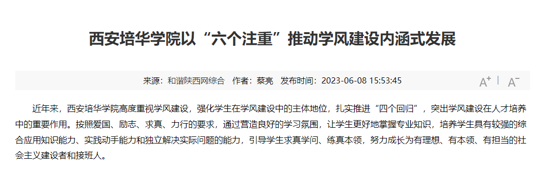 近年来,西安培华学院高度重视学风建设,强化学生在学风建设中的主体地位,扎实推进“四个回归”,突出学风建设在人才培养中的重要作用。按照爱国、励志、求真、力行的要求,通过营造良好的学习氛围,让学生更好地掌握专业知识,培养学生具有较强的综合应用知识能力、实践动手能力和独立解决实际问题的能力,引导学生求真学问、练真本领,努力成长为有理想、有本领、有担当的社会主义建设者和接班人。
