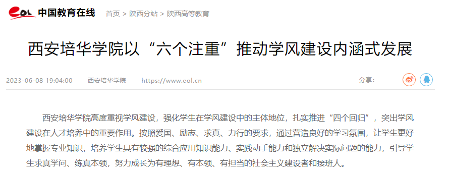 西安培华学院高度重视学风建设,强化学生在学风建设中的主体地位,扎实推进“四个回归”,突出学风建设在人才培养中的重要作用。按照爱国、励志、求真、力行的要求,通过营造良好的学习氛围,让学生更好地掌握专业知识,培养学生具有较强的综合应用知识能力、实践动手能力和独立解决实际问题的能力,引导学生求真学问、练真本领,努力成长为有理想、有本领、有担当的社会主义建设者和接班人。