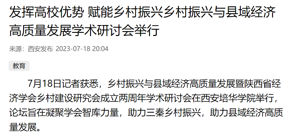 7月18日记者获悉,乡村振兴与县域经济高质量发展暨陕西省经济学会乡村建设研究会成立两周年学术研讨会在西安培华学院举行,论坛旨在凝聚学会智库力量,助力三秦乡村振兴,助力县域经济高质量发展。