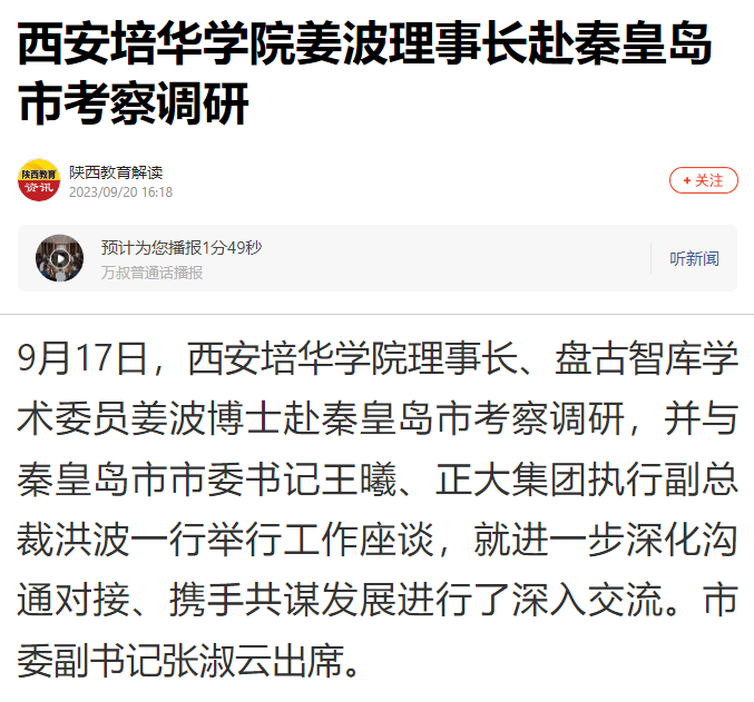 9月17日,西安培华学院理事长、盘古智库学术委员姜波博士赴秦皇岛市考察调研,并与秦皇岛市市委书记王曦、正大集团执行副总裁洪波一行举行工作座谈,就进一步深化沟通对接、携手共谋发展进行了深入交流。市委副书记张淑云出席。