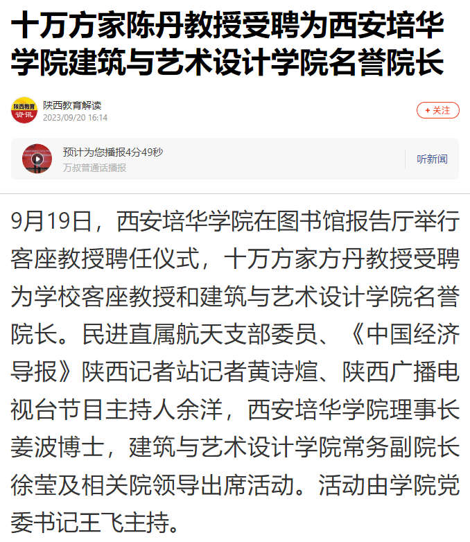 搜狐新闻:十万方家陈丹教授受聘为西安培华学院建筑与艺术设计学院名誉院长