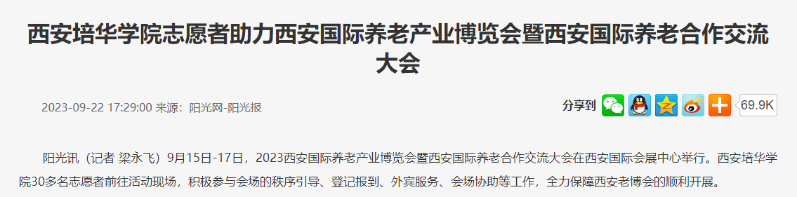 阳光讯(记者 梁永飞)9月15日-17日,2023西安国际养老产业博览会暨西安国际养老合作交流大会在西安国际会展中心举行。西安培华学院30多名志愿者前往活动现场,积极参与会场的秩序引导、登记报到、外宾服务、会场协助等工作,全力保障西安老博会的顺利开展。