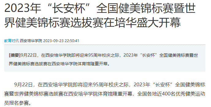9月22日,在西安培华学院即将迎来95周年校庆之际,2023年“长安杯”全国健美锦标赛暨世界健美锦标赛选拔赛在西安培华学院体育馆隆重开幕,全国各地近400名优秀健美运动员报名参赛。