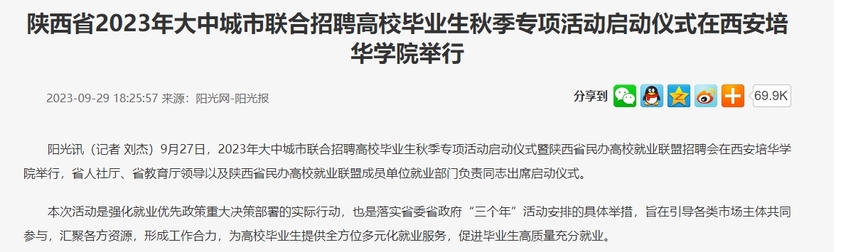 阳光网:陕西省2023年大中城市联合招聘高校毕业生秋季专项活动启动仪式在西安培华学院举行
