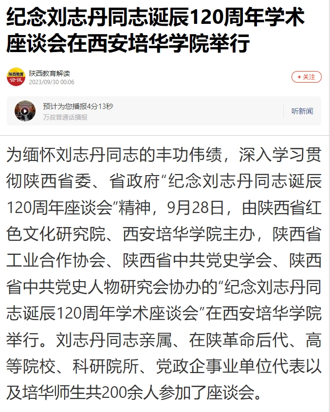 搜狐新闻:纪念刘志丹同志诞辰120周年学术座谈会在西安培华学院举行