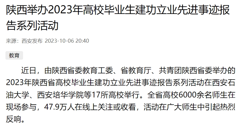 近日,由陕西省委教育工委、省教育厅、共青团陕西省委举办的2023年陕西省高校毕业生建功立业先进事迹报告系列活动在西安石油大学、西安培华学院等17所高校举行。全省高校6000余名师生在现场参与,47.9万人在线上关注或收看,活动在广大师生中引起热烈反响。