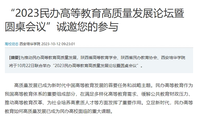 为推动民办高等教育高质量发展,陕西省高等教育学会、陕西省民办教育协会、西安培华学院将于10月22日联合举办“2023民办高等教育高质量发展论坛暨圆桌会议”(以下简称“论坛”)。在培华建校95周年之际,通过本次论坛,旨在搭建一个学术交流平台,汇聚高等教育专家学者、民办高校负责人、行业企业专家等,分享办学经验、探讨发展路径,形成提升民办高等教育高质量发展的策略。我们诚挚邀请民办高校董事长(理事长)、校长,高等教育专家学者出席此次盛会。您的出席将为本次论坛增添更多的精彩与深度,为与会嘉宾带来全新的启示和思考。