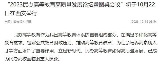 为推动民办高等教育高质量发展,陕西省高等教育学会、陕西省民办教育协会、西安培华学院将于10月22日联合举办“2023民办高等教育高质量发展论坛暨圆桌会议”(以下简称“论坛”)。在培华建校95周年之际,通过本次论坛,旨在搭建一个学术交流平台,汇聚高等教育专家学者、民办高校负责人、行业企业专家等,分享办学经验、探讨发展路径,形成提升民办高等教育高质量发展的策略。我们诚挚邀请民办高校董事长(理事长)、校长,高等教育专家学者出席此次盛会。您的出席将为本次论坛增添更多的精彩与深度,为与会嘉宾带来全新的启示和思考。