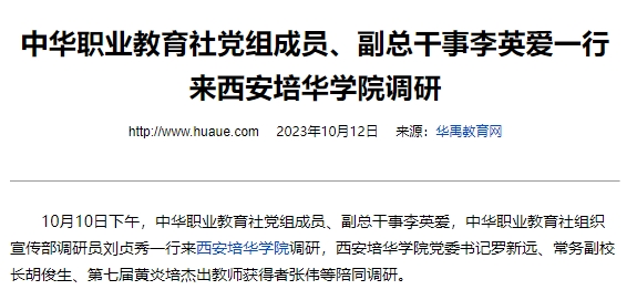 10月10日下午,中华职业教育社党组成员、副总干事李英爱,中华职业教育社组织宣传部调研员刘贞秀一行来西安培华学院调研,西安培华学院党委书记罗新远、常务副校长胡俊生、第七届黄炎培杰出教师获得者张伟等陪同调研。
