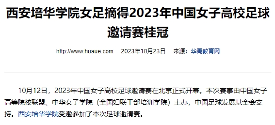 10月12日,2023年中国女子高校足球邀请赛在北京正式开幕。本次赛事由中国女子高等院校联盟、中华女子学院(全国妇联干部培训学院)主办,中国足球发展基金会支持。西安培华学院受邀参加了本次足球邀请赛。
