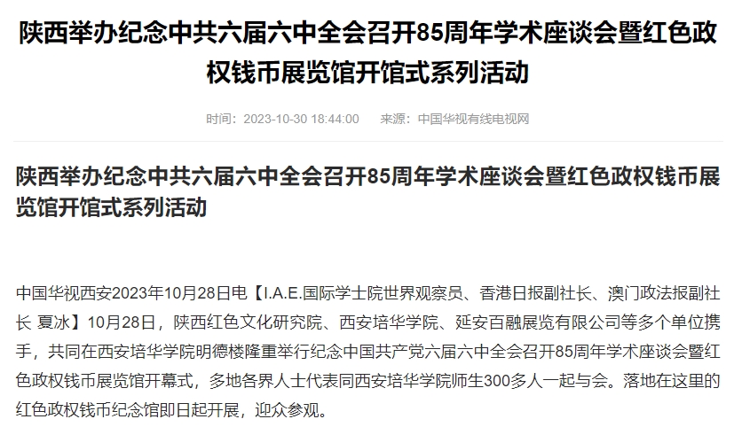 中国华视西安2023年10月28日电【I.A.E.国际学士院世界观察员、香港日报副社长、澳门政法报副社长 夏冰】10月28日,陕西红色文化研究院、西安培华学院、延安百融展览有限公司等多个单位携手,共同在西安培华学院明德楼隆重举行纪念中国共产党六届六中全会召开85周年学术座谈会暨红色政权钱币展览馆开幕式,多地各界人士代表同西安培华学院师生300多人一起与会。落地在这里的红色政权钱币纪念馆即日起开展,迎众参观。