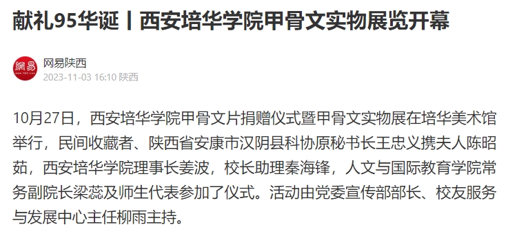 10月27日,西安培华学院甲骨文片捐赠仪式暨甲骨文实物展在培华美术馆举行,民间收藏者、陕西省安康市汉阴县科协原秘书长王忠义携夫人陈昭茹,西安培华学院理事长姜波,校长助理秦海锋,人文与国际教育学院常务副院长梁蕊及师生代表参加了仪式。活动由党委宣传部部长、校友服务与发展中心主任柳雨主持。