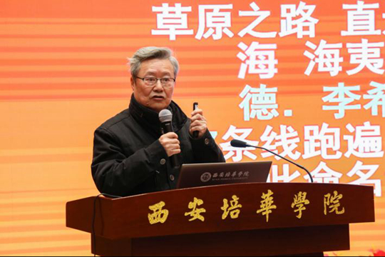 著名文化学者、德艺双馨艺术家、陕西省文联原主席、陕西省传统文化发展促进会终身名誉会长肖云儒教授作《传统文化和丝绸之路》的主旨报告。肖云儒教授讲述了从海上丝路到陆上丝路的历程,强调了古代丝绸之路与中国、世界历史之间的双向作用。他以自己的游历经历勉励同学们以丝绸之路为始,不断守正创新,为传承中华优秀传统文化贡献力量!