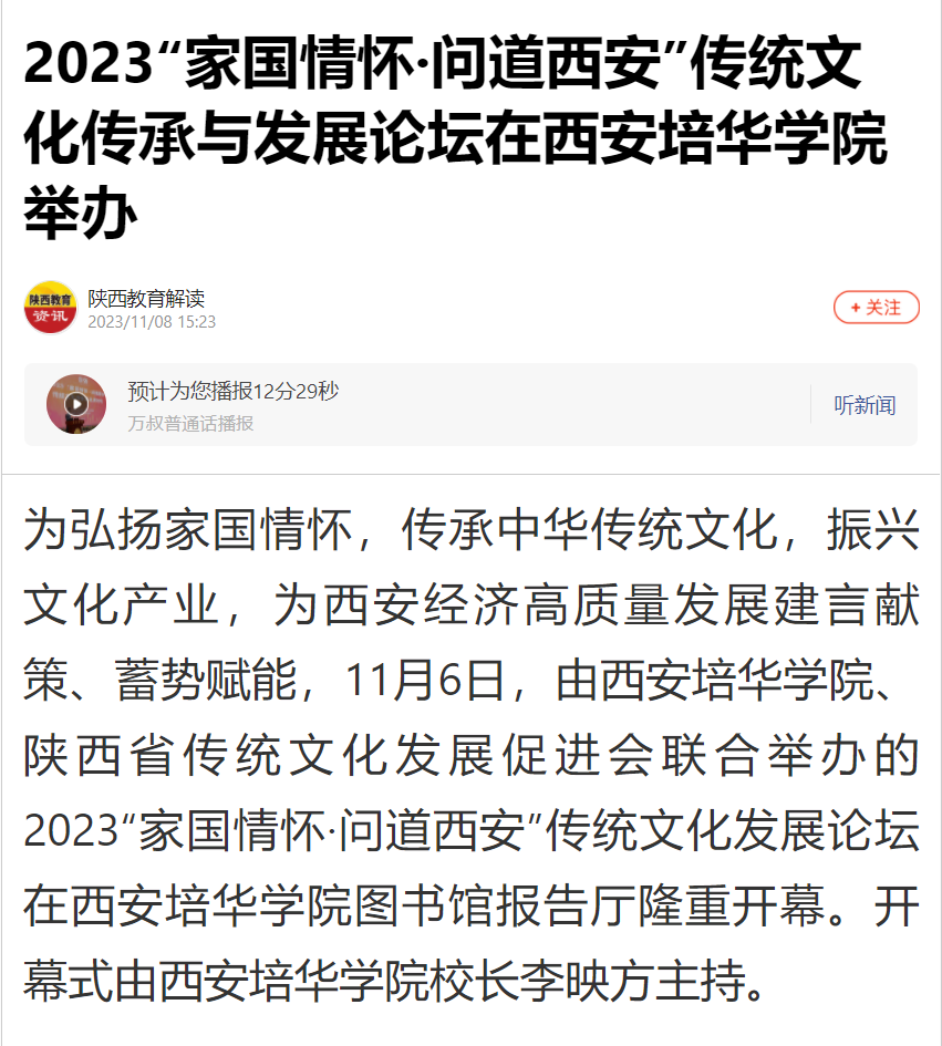 搜狐新闻:2023“家国情怀·问道西安”传统文化传承与发展论坛在西安培华学院举办