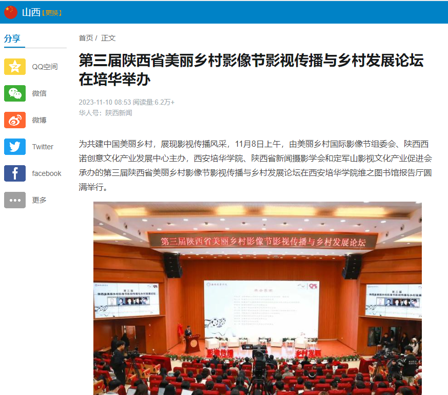 为共建中国美丽乡村,展现影视传播风采,11月8日上午,由美丽乡村国际影像节组委会、陕西西诺创意文化产业发展中心主办,西安培华学院、陕西省新闻摄影学会和定军山影视文化产业促进会承办的第三届陕西省美丽乡村影像节影视传播与乡村发展论坛在西安培华学院维之图书馆报告厅圆满举行。