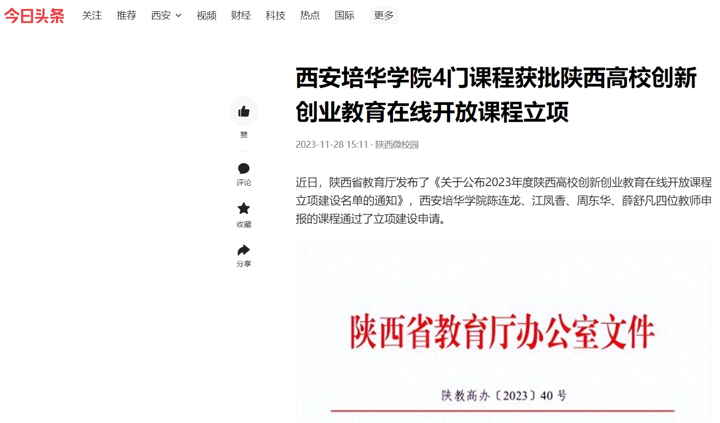 今日头条:西安培华学院4门课程获批陕西高校创新创业教育在线开放课程立项