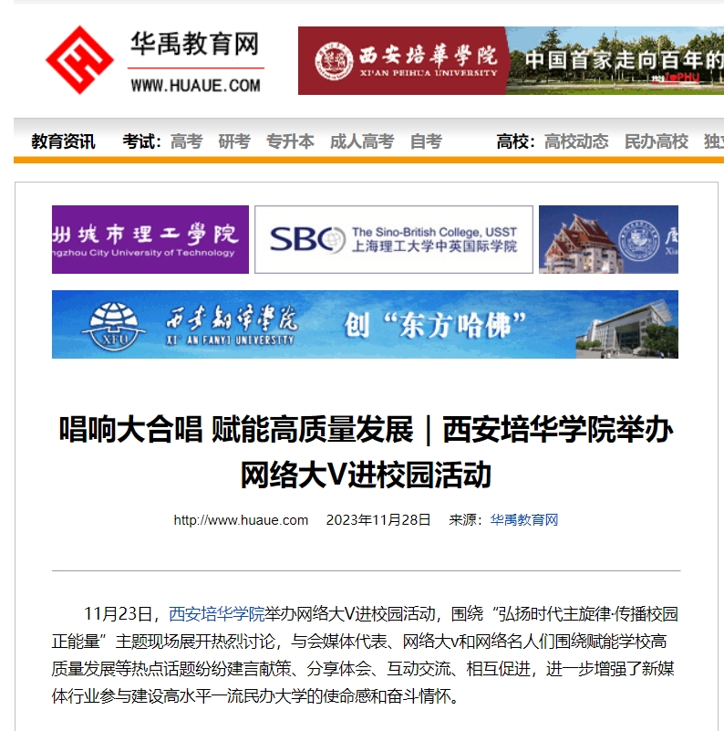 11月23日,西安培华学院举办网络大V进校园活动,围绕“弘扬时代主旋律·传播校园正能量”主题现场展开热烈讨论,与会媒体代表、网络大v和网络名人们围绕赋能学校高质量发展等热点话题纷纷建言献策、分享体会、互动交流、相互促进,进一步增强了新媒体行业参与建设高水平一流民办大学的使命感和奋斗情怀。