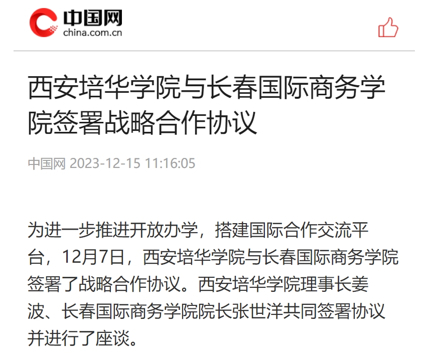 为进一步推进开放办学,搭建国际合作交流平台,12月7日,西安培华学院与长春国际商务学院签署了战略合作协议。西安培华学院理事长姜波、长春国际商务学院院长张世洋共同签署协议并进行了座谈。