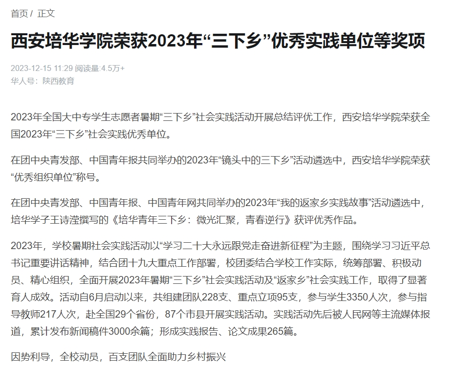 华人头条:西安培华学院荣获2023年“三下乡”优秀实践单位等奖项