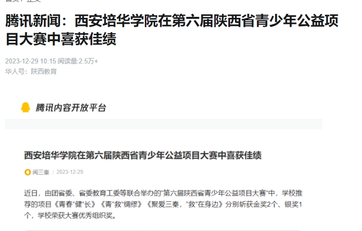华人头条:腾讯新闻:西安培华学院在第六届陕西省青少年公益项目大赛中喜获佳绩