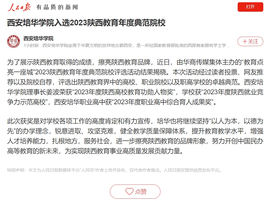 人民日报:西安培华学院入选2023陕西教育年度典范院校