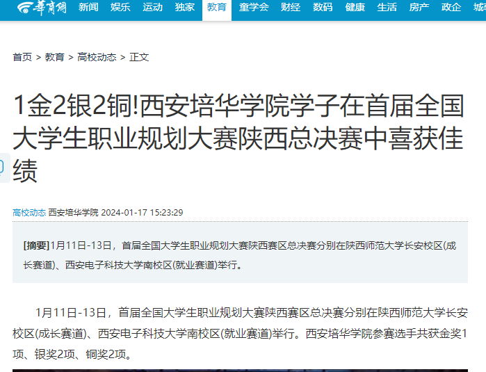本次大赛以“筑梦青春志在四方,规划启航职引未来”为主题。陕西省93所高校的39.5万余名学生参与了大赛,最终有200名选手入围省赛。决赛分为现场陈述、评委提问(综合面试)、“天降(实习)offer”等多个环节,经过激烈的角逐,学校人文与国际教育学院卜晓婷同学获得成长赛道高教组决赛金奖、人文与国际教育学院赵晨阳同学获得就业赛道高职组决赛银奖、医学院燕心雨同学获得成长赛道高教组决赛银奖、传媒学院张欣同学获得就业赛道高教组决赛,总成绩在全省同类院校中位列第一,晋级名额及奖牌数量,在同类院校中位列第一。