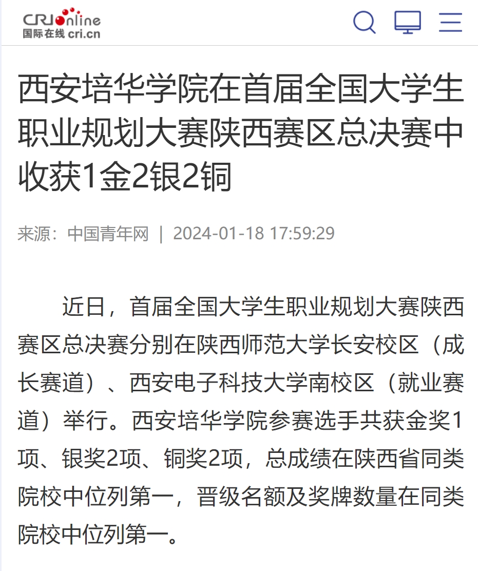 近日,首届全国大学生职业规划大赛陕西赛区总决赛分别在陕西师范大学长安校区(成长赛道)、西安电子科技大学南校区(就业赛道)举行。西安培华学院参赛选手共获金奖1项、银奖2项、铜奖2项,总成绩在陕西省同类院校中位列第一,晋级名额及奖牌数量在同类院校中位列第一。
