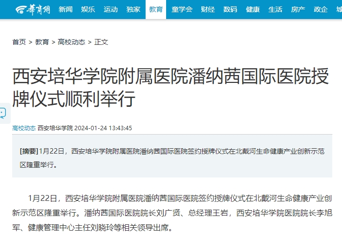 1月22日,西安培华学院附属医院潘纳茜国际医院签约授牌仪式在北戴河生命健康产业创新示范区隆重举行。潘纳茜国际医院院长刘广贤、总经理王岩,西安培华学院医院院长李旭军、健康管理中心主任刘晓玲等相关领导出席。