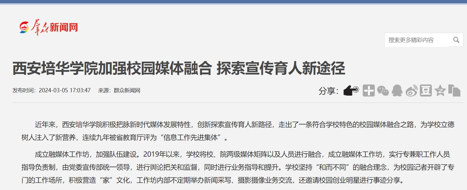 近年来,西安培华学院积极把脉新时代媒体发展特性,创新探索宣传育人新路径,走出了一条符合学校特色的校园媒体融合之路,为学校立德树人注入了新营养,连续九年被省教育厅评为“信息工作先进集体”。