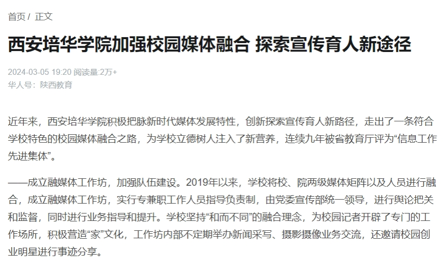 近年来,西安培华学院积极把脉新时代媒体发展特性,创新探索宣传育人新路径,走出了一条符合学校特色的校园媒体融合之路,为学校立德树人注入了新营养,连续九年被省教育厅评为“信息工作先进集体”。