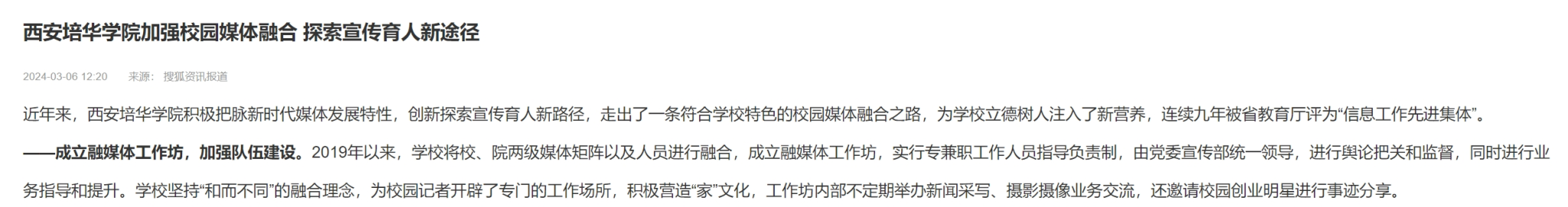 近年来,陕西省西安培华学院积极把脉新时代媒体发展特性,创新探索宣传育人新路径,走出了一条符合学校特色的校园媒体融合之路,连续9年被省教育厅评为“信息工作先进集体”。