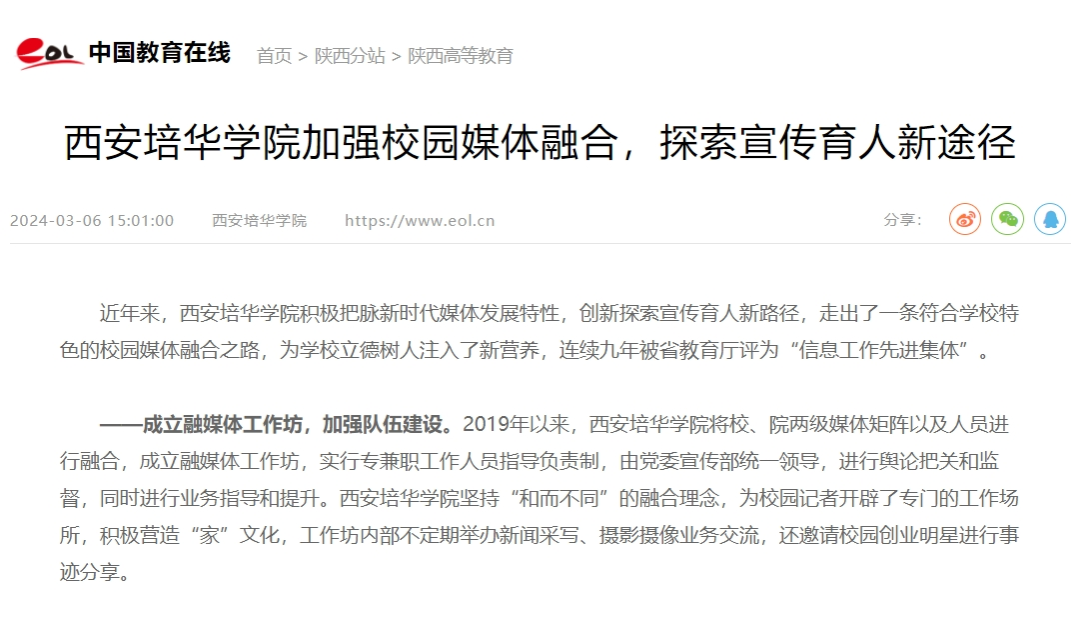 近年来,陕西省西安培华学院积极把脉新时代媒体发展特性,创新探索宣传育人新路径,走出了一条符合学校特色的校园媒体融合之路,连续9年被省教育厅评为“信息工作先进集体”。