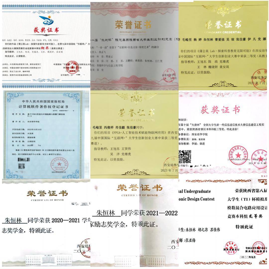 朱恒林在求学道路上虽有艰辛,但他从未放弃,取得了丰硕的成果。他曾连续两年荣获国家励志奖学金,还在社会实践和竞赛活动中取得了优异成绩:如德州仪器(TI)杯模拟及模数混合电路应用设计竞赛二等奖、全国高校商业精英挑战赛创新创业竞赛三等奖、第九届中国国际“互联网+”大学生创新创业大赛铜奖、“大唐杯”全国大学生移动通信5G技术大赛三等奖等。