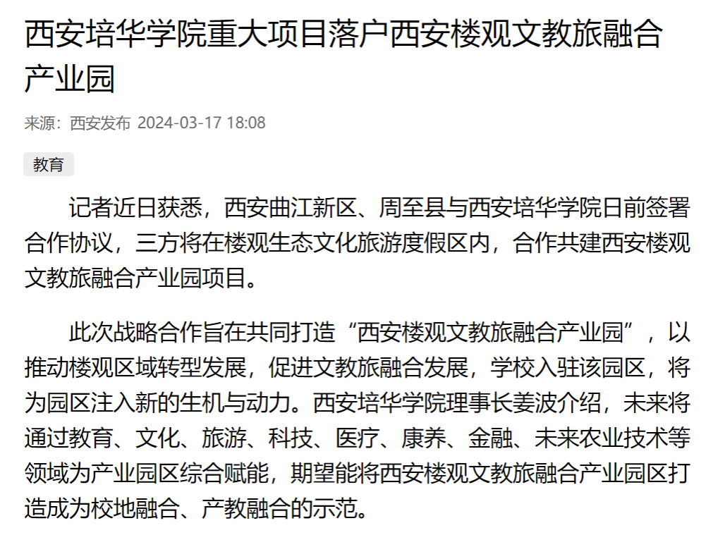 记者近日获悉,西安曲江新区、周至县与西安培华学院日前签署合作协议,三方将在楼观生态文化旅游度假区内,合作共建西安楼观文教旅融合产业园项目。