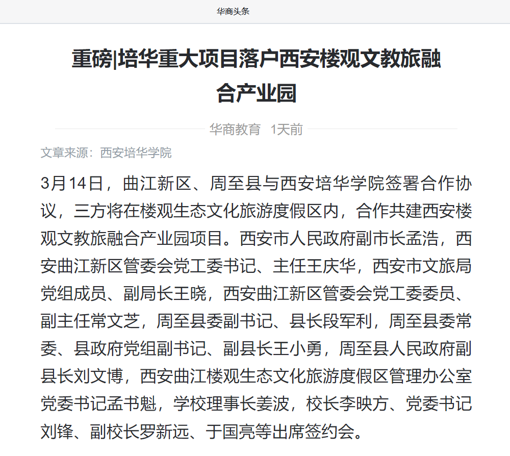 3月14日,曲江新区、周至县与西安培华学院签署合作协议,三方将在楼观生态文化旅游度假区内,合作共建西安楼观文教旅融合产业园项目。西安市人民政府副市长孟浩,西安曲江新区管委会党工委书记、主任王庆华,西安市文旅局党组成员、副局长王晓,西安曲江新区管委会党工委委员、副主任常文芝,周至县委副书记、县长段军利,周至县委常委、县政府党组副书记、副县长王小勇,周至县人民政府副县长刘文博,西安曲江楼观生态文化旅游度假区管理办公室党委书记孟书魁,学校理事长姜波,校长李映方、党委书记刘锋、副校长罗新远、于国亮等出席签约会。