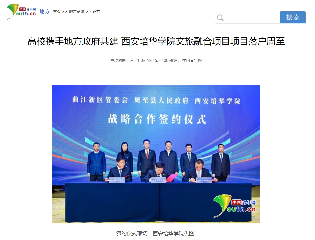 3月14日,西安曲江新区、周至县与西安培华学院签署合作协议,三方将在楼观生态文化旅游度假区内,合作共建西安楼观文教旅融合产业园项目。西安市人民政府副市长孟浩,西安曲江新区党工委书记、管委会主任王庆华,西安市文旅局党组成员、副局长王晓,西安曲江新区党工委委员、管委会副主任常文芝,周至县委副书记、县长段军利,周至县委常委、县政府党组副书记、副县长王小勇,副县长刘文博,西安曲江楼观生态文化旅游度假区管理办公室党委书记孟书魁,西安培华学院理事长姜波,校长李映方、党委书记刘锋、副校长罗新远、于国亮等出席签约会。