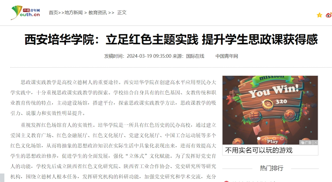 重视发挥红色场馆育人的实效性。培华学院是一所具有红色历史的民办高校,通过建立爱国主义教育广场、红色金融展厅、红色文化展厅、党建文化展厅、中国工合运动展等多个红色文化场馆,从而将抽象的思想政治知识在实际生活中具象化表现出来,进而有效提高大学生的思想政治修养,促进学生的全面发展,强化“立体式”文化赋能。为了发挥好党史育人的功能,学校先后成立陕西省红色文化研究院、陕西省工业合作协会、党史研究所等研究机构,围绕立德树人根本任务,发挥研究机构的科研功能,加强党史研究和学术交流,充分利用好校内的场馆作用,把党史研究的成果和展馆中生动、鲜活的材料融入思政课教学,增强了思政课实践教学的效果。