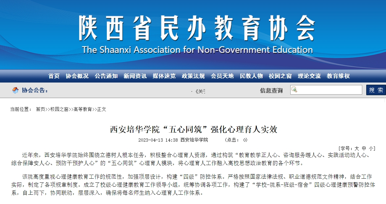 近年来,西安培华学院始终围绕立德树人根本任务,积极整合心理育人资源,通过构筑“教育教学正人心、咨询服务暖人心、实践活动动人心、综合保障安人心、预防干预护人心”的“五心同筑”心理育人模块,将心理育人工作融入高校思想政治教育的各个环节。