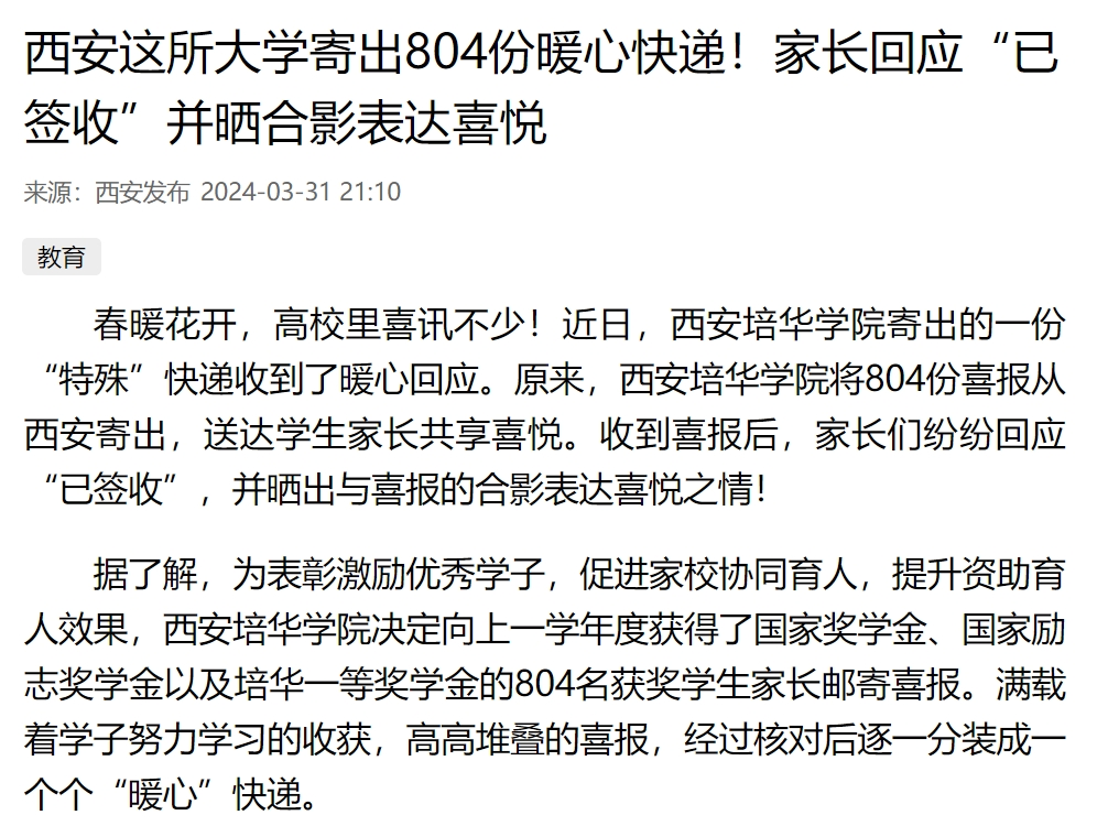 春暖花开,高校里喜讯不少!近日,西安培华学院寄出的一份“特殊”快递收到了暖心回应。原来,西安培华学院将804份喜报从西安寄出,送达学生家长共享喜悦。收到喜报后,家长们纷纷回应“已签收”,并晒出与喜报的合影表达喜悦之情!